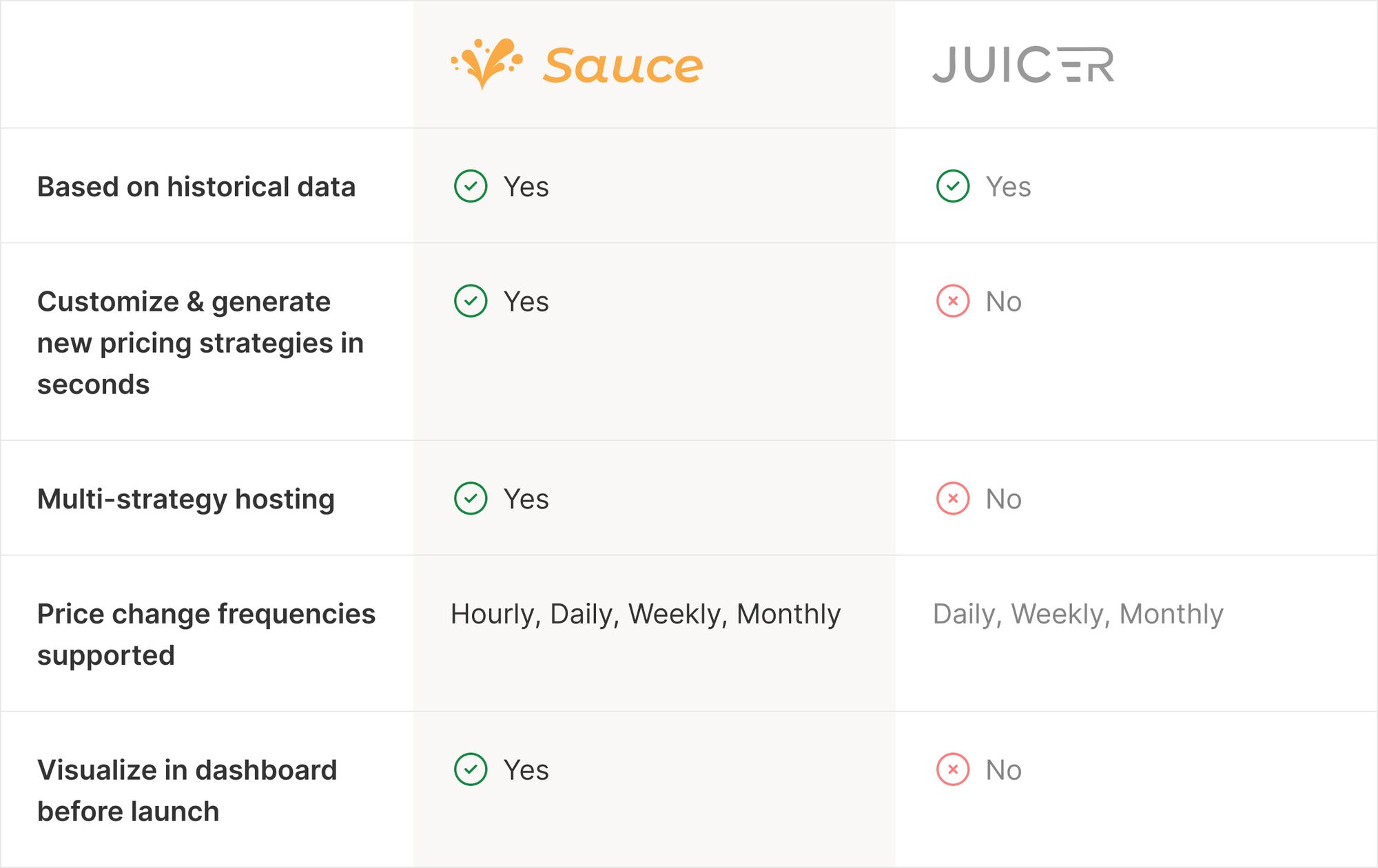 Although Juicer technically has a “Dynamic Pricing” offering within its product suite, a closer look will reveal that the functionality is extremely primitive when compared to a focused Dynamic Pricing vendor like Sauce. We actually have quite a few customers who have evaluated Juicer for Dynamic Pricing use cases. There are several key things to consider when comparing Dynamic Pricing capabilities like flexibility, integration support, strategy management, metrics, and control.