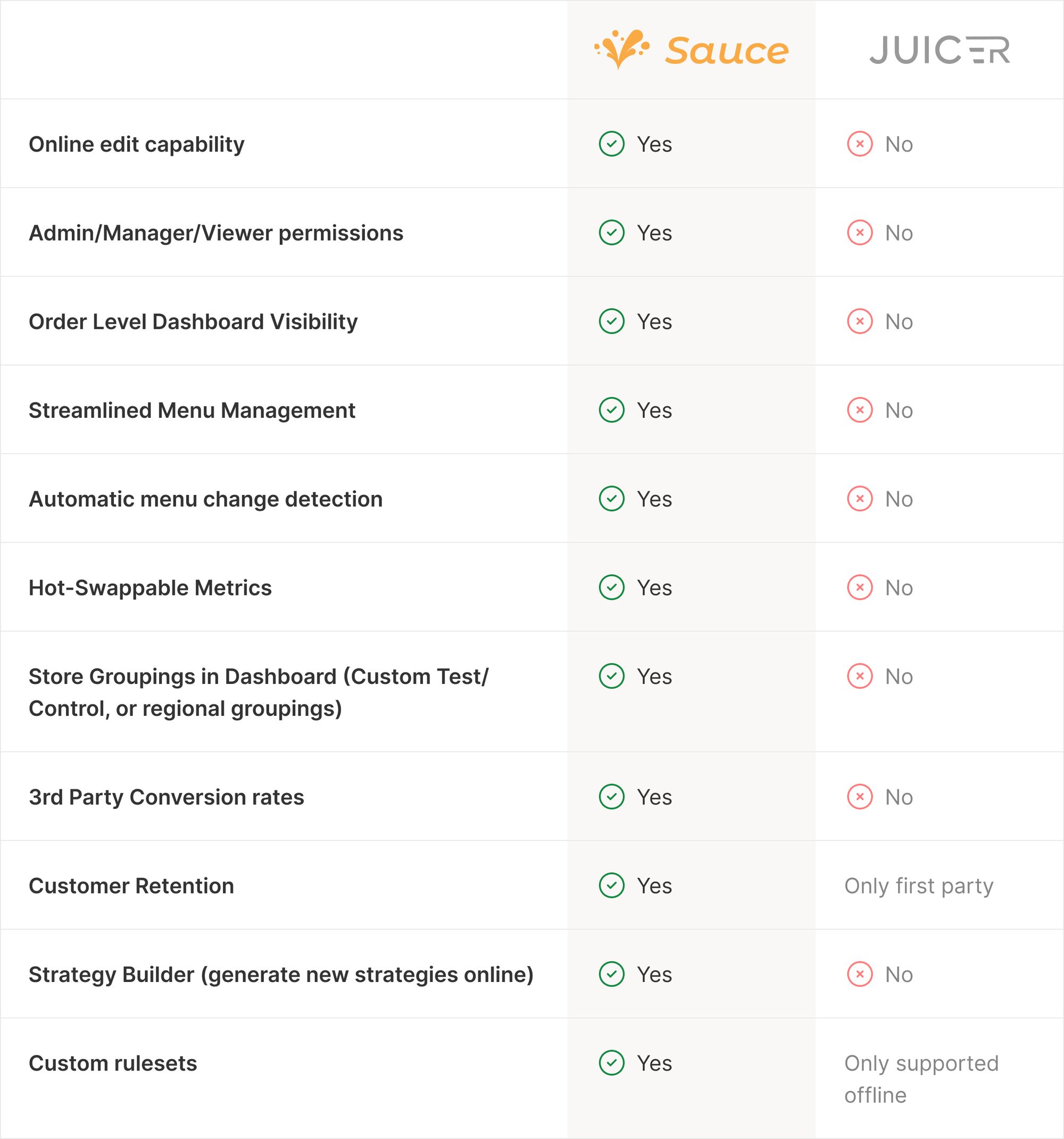 Although Juicer can be a good option for a first party price comparison widget, for full scale dynamic pricing, Sauce offers better features for restaurant marketing, IT, and finance teams.